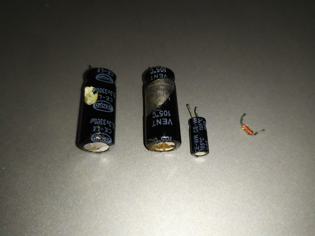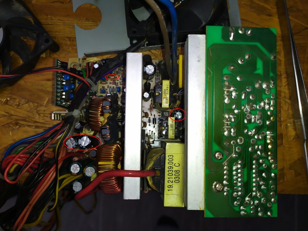 It turn out that there is surely a problem with capacitors. I started with replacing two 3300uF/6.3V near the 3.3V line which was leaked (C13 and C15). Here are the new ones: